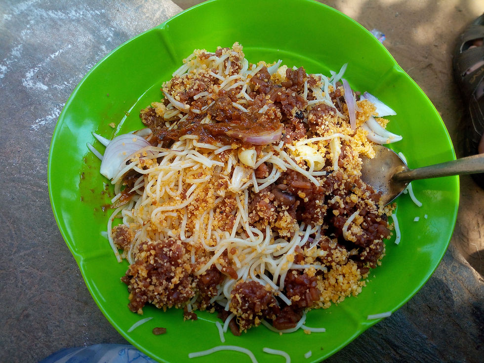 Waakye is extremely common and cheap in all parts of Ghana. It's mostly beans, rice, gari, noodles, stew and sometimes an egg or meat.